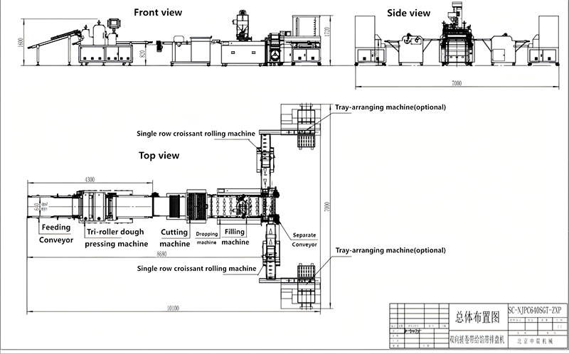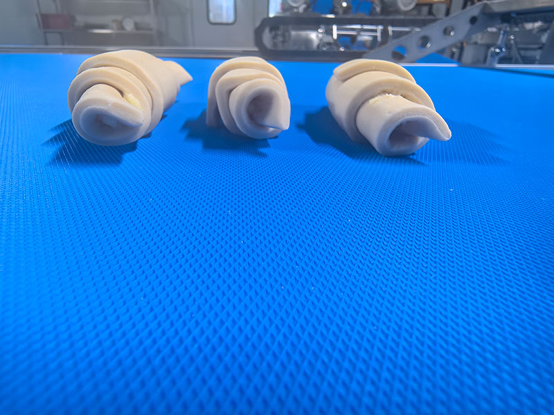 Линия включает многовалковую тестораскаточную машину, резак тестового пласта, модуль выравнивания и укладки тестового пласта, модуль «следящего» внесения начинки, разводящий конвейер с распределением по левому и правому потокам, а также две машины для формирования и скрутки круассанов.